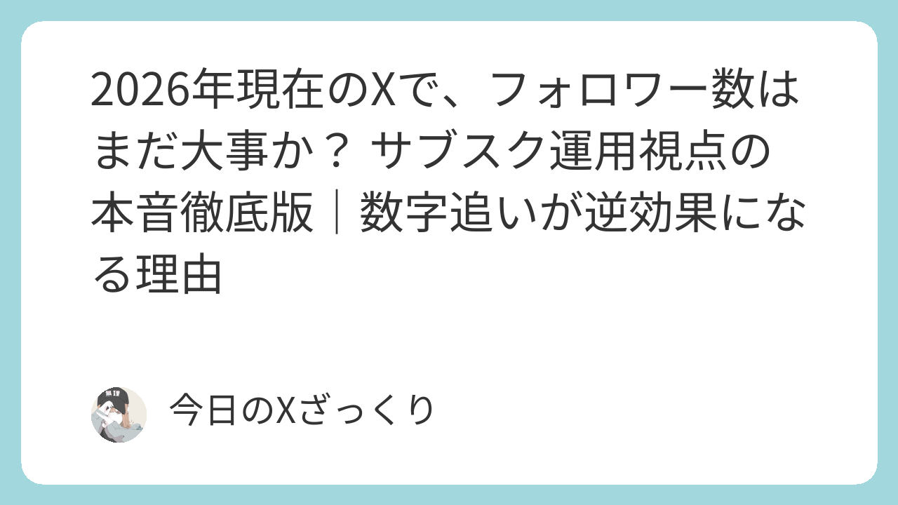 2026年現在、Xでサブスクを回すならフォロワー数は「サブスク始める前はまだ大事」だけど、「回し始めたらむしろ邪魔になる場合もある」レベルまで変わってます。アルゴリズムが関係性深度と滞在時間を最優先にする今、無理に数字を追うより「少ない人数でも深く刺さる投稿」を続けるのが勝ちパターン。コア層の熱量を追えば、For You爆発+転換率UP+収入安定が現実的です。