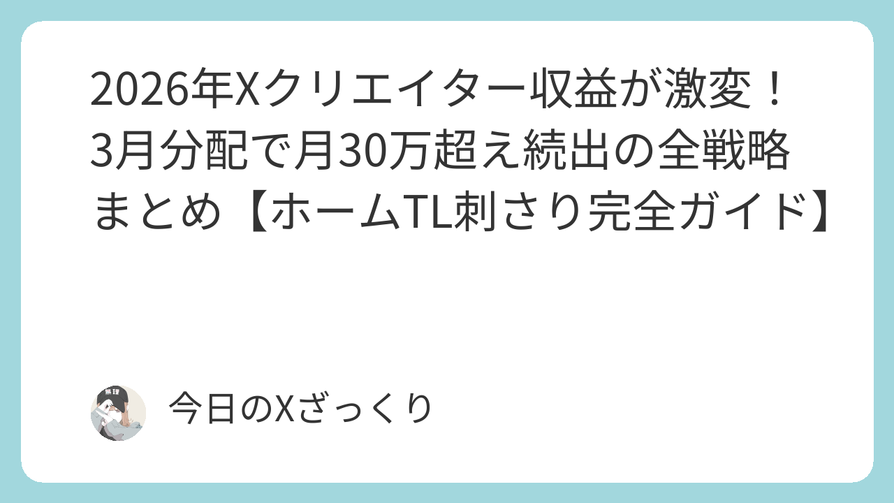 ※本記事は2026年3月時点の分配データ・クリエイター報告に基づく分析です。Xのアルゴリズム・ポリシーは変動するため、公式アナウンスを必ず併せて確認してください。