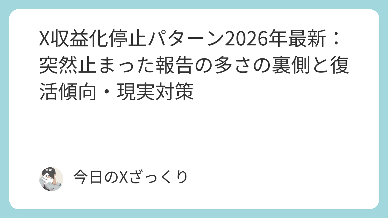2026年現在、Xの収益化が「突然止まった」という報告が本当に多く、私の周りでも毎週のように誰かが停止しています。特に2025年後半から2026年にかけてのアルゴリズム強化とポリシー厳格化が影響大。公開情報やユーザー報告を基に、今わかっている停止パターン、実際に復活した人・復活しなかった人の傾向、そして今すぐできる「停止リスクを下げる現実的な対策」をまとめました。