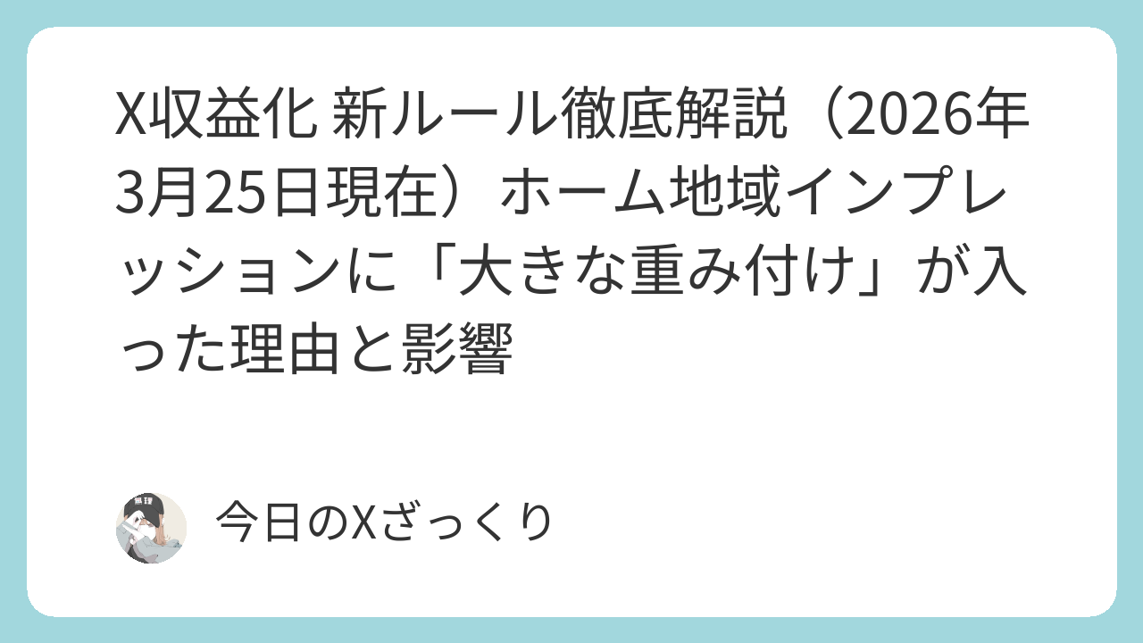 2026年3月27日(木)から、X(旧Twitter)のクリエイター収益化プログラムに重大な新ルールが導入されます。Head of ProductのNikita Bier氏が公式に発表した内容で、「同じ地域(ホーム地域・国)からのインプレッションに大きな重み付け」が適用されることになりました。